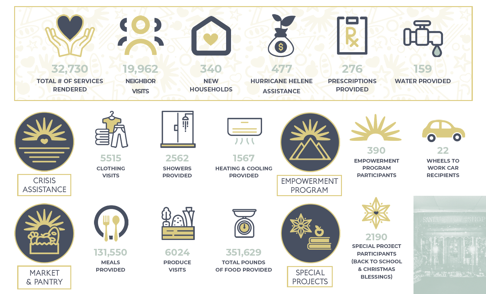 We connect with residents of Transylvania County to deliver crisis assistance and develop programs that create lasting solutions to hunger and poverty. We provide essential services in a trauma-informed environment, including food and fresh produce, gently-used clothing, rent and utility assistance, household goods, and camping equipment. Our facility offers hot showers, a safe space for sharing stories of struggle, and a refuge of belonging.