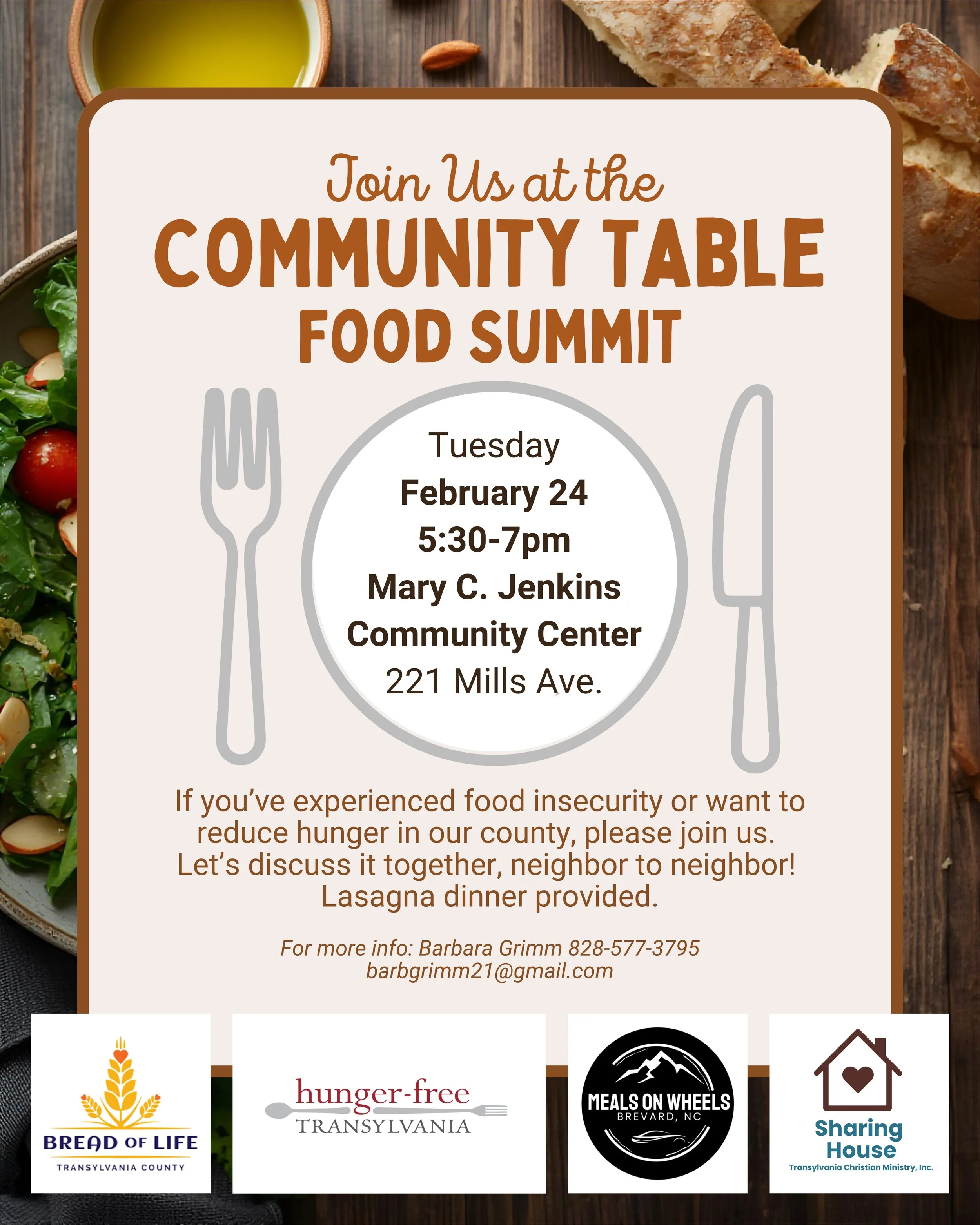 Hosted by: Hunger Coalition of Transylvania County, The Bread of Life, Meals on Wheels of Brevard, and Sharing House